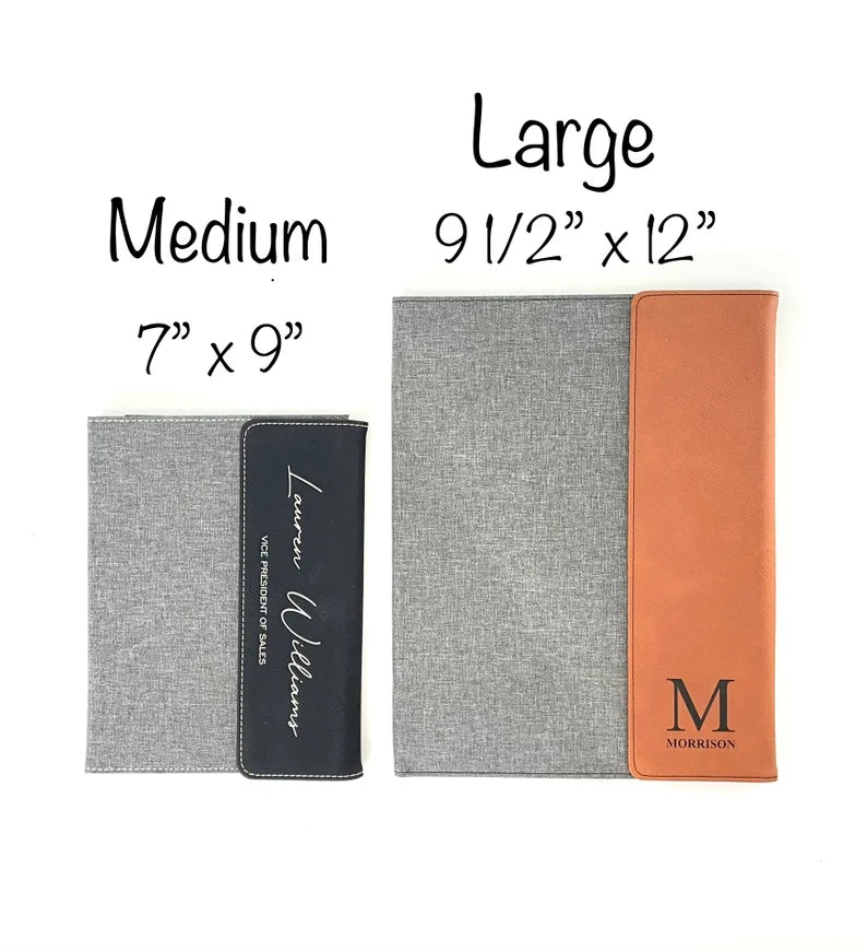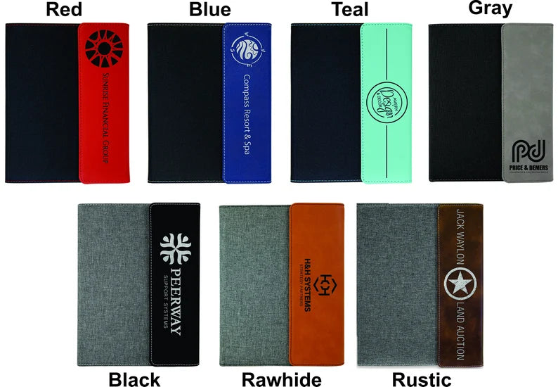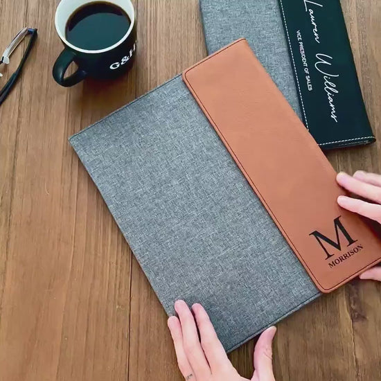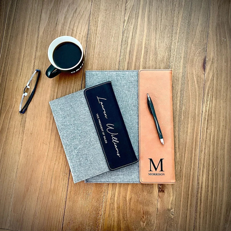 Stay stylishly organized with our custom canvas and vegan leatherette portfolios! Each personalized portfolio is laser-engraved just the way you like!